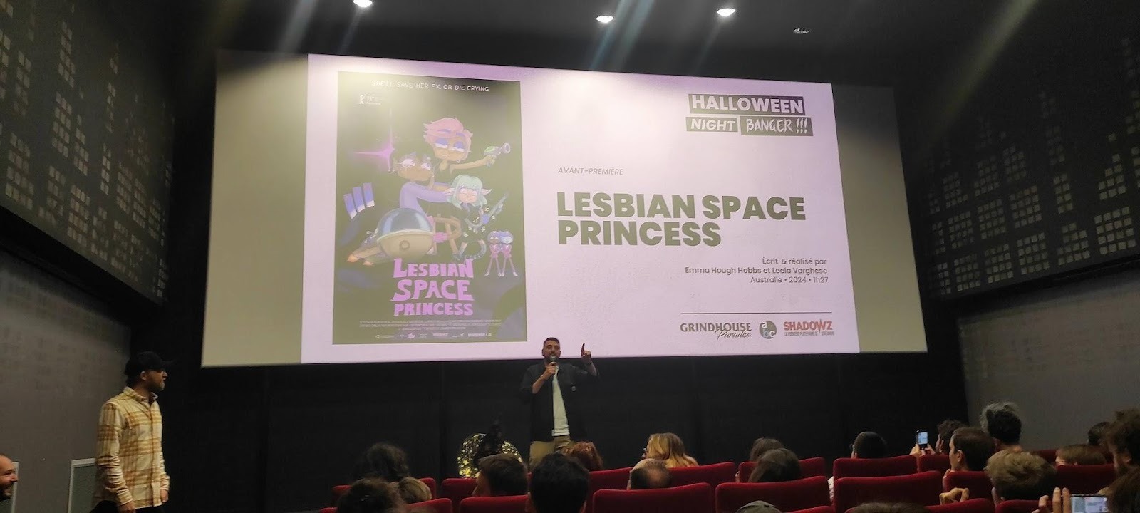 Faisant écho à son exposition présente dans l’enceinte de l’ABC, l’équipe du Grindhouse nous a présenté en deuxième partie de soirée Lesbian Space Princess, premier long métrage d’Emma Hough Hobbs et Leela Varghese. Un ovni pop, queer et acidulé. Quelque part entre Rick & Morty, Adventure Time, Futurama et Scott Pilgrim, le film affirme sa filiation avec l’animation américaine, tout en la réinventant pour servir un propos qui se veut résolument queer et féministe.