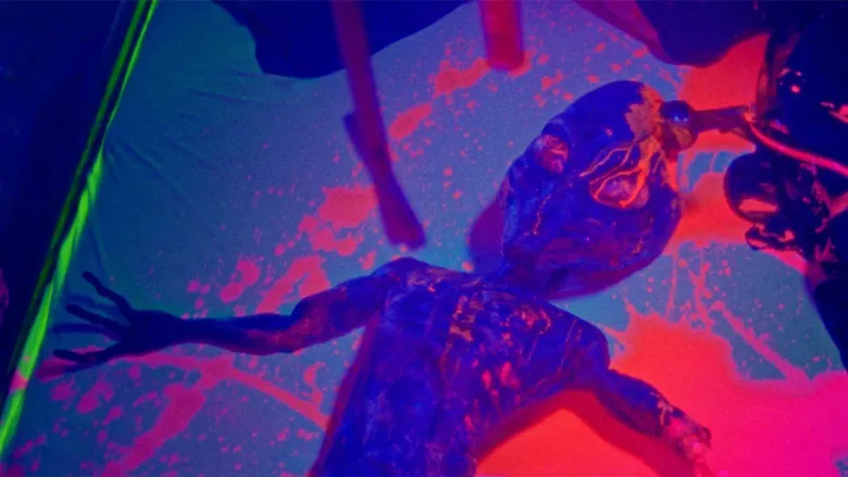 Le film, court, mais intense, se situe à l’intersection entre le trip expérimental et la série B : bad trip sanglant, il est une succession frénétique de bastons hallucinées contre des aliens résolument DIY, de hurlements, d’effets strobo UV, et de caméra subjective à rendre épileptique. Une mention spéciale au plus gros ratio de “fuck” par séquence de l’histoire du cinéma.