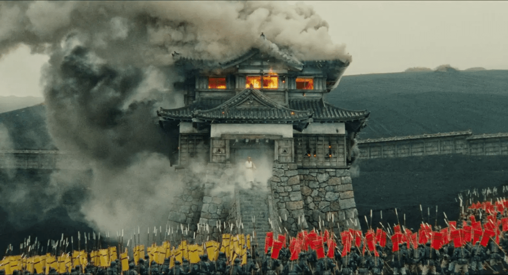 La bataille qui verra s’affronter deux fils face à leur père, jusqu’à la destruction de son château et son exil, est un des affrontements les plus incroyables que j’ai pu voir au cinéma. Les couleurs très marquées des différentes factions facilitent la compréhension des mouvements de troupes. Les différents types de soldats — cavalerie, infanterie, archers et commandements — apportent tous un peu à la rage déferlée sur le château du père Hidetora.